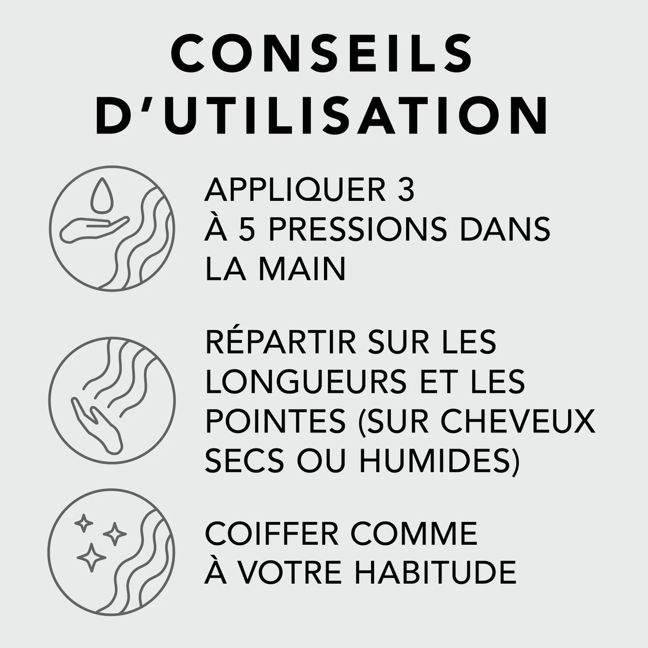 – APPLIQUER 1 à 2 gouttes sur cheveux secs ou humides, des mi-longueurs jusqu’aux pointes