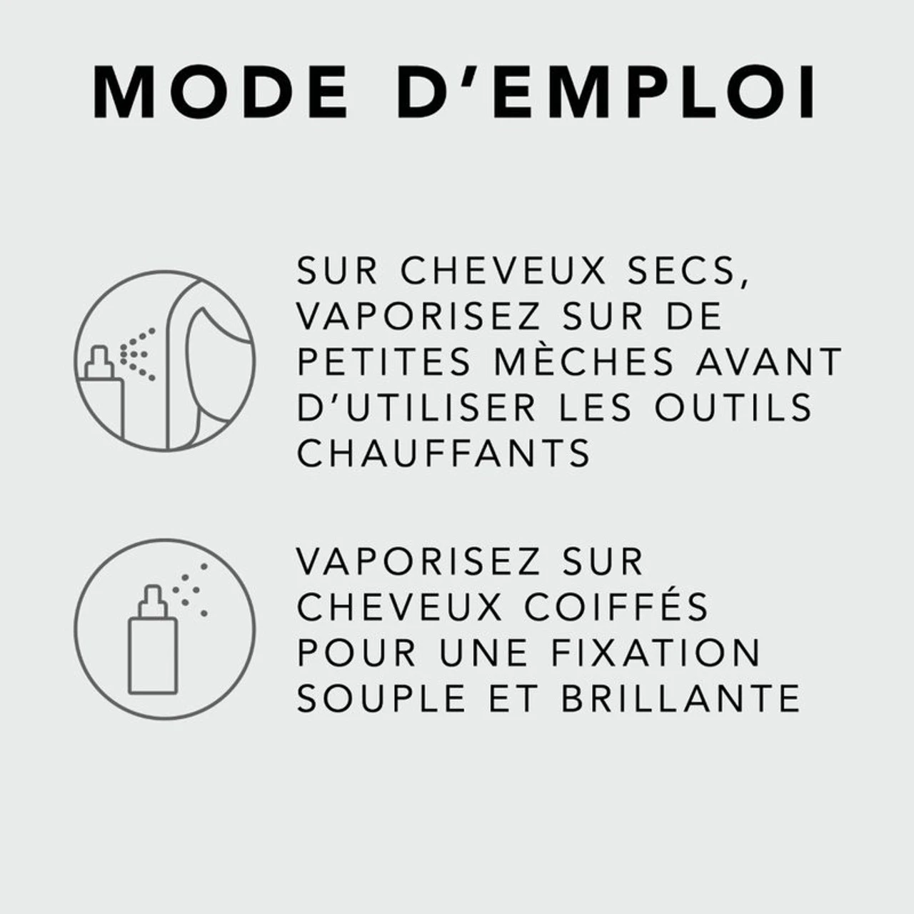 – Vaporisez sur n’importe quelle coiffure pour une fixation souple et une finition brillante